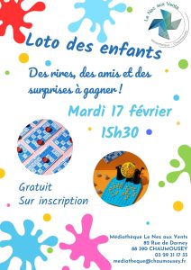La médiathèque le “Nez aux Vents” propose un Loto des enfants le mardi 17 février à 15H30.