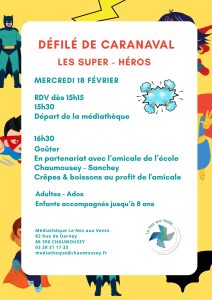 La médiathèque le “Nez aux Vents”, en partenariat avec l’amicale de l’école de Chaumousey- Sanchey, propose un défilé de carnaval sur le thème des Super-Héros le mercredi 18 février à partir de 15H30.