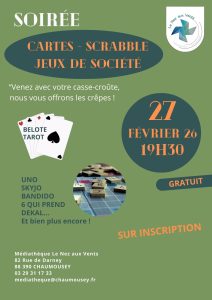 La médiathèque le ” Nez aux Vents” propose une soirée jeux de cartes, scrabble et jeux de société le vendredi 27 février à 19H30.